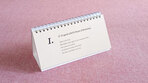 Het flip-over-boekje is voorzien van een ringbinding, en kan rechtopstaand op tafel geplaatst worden.
